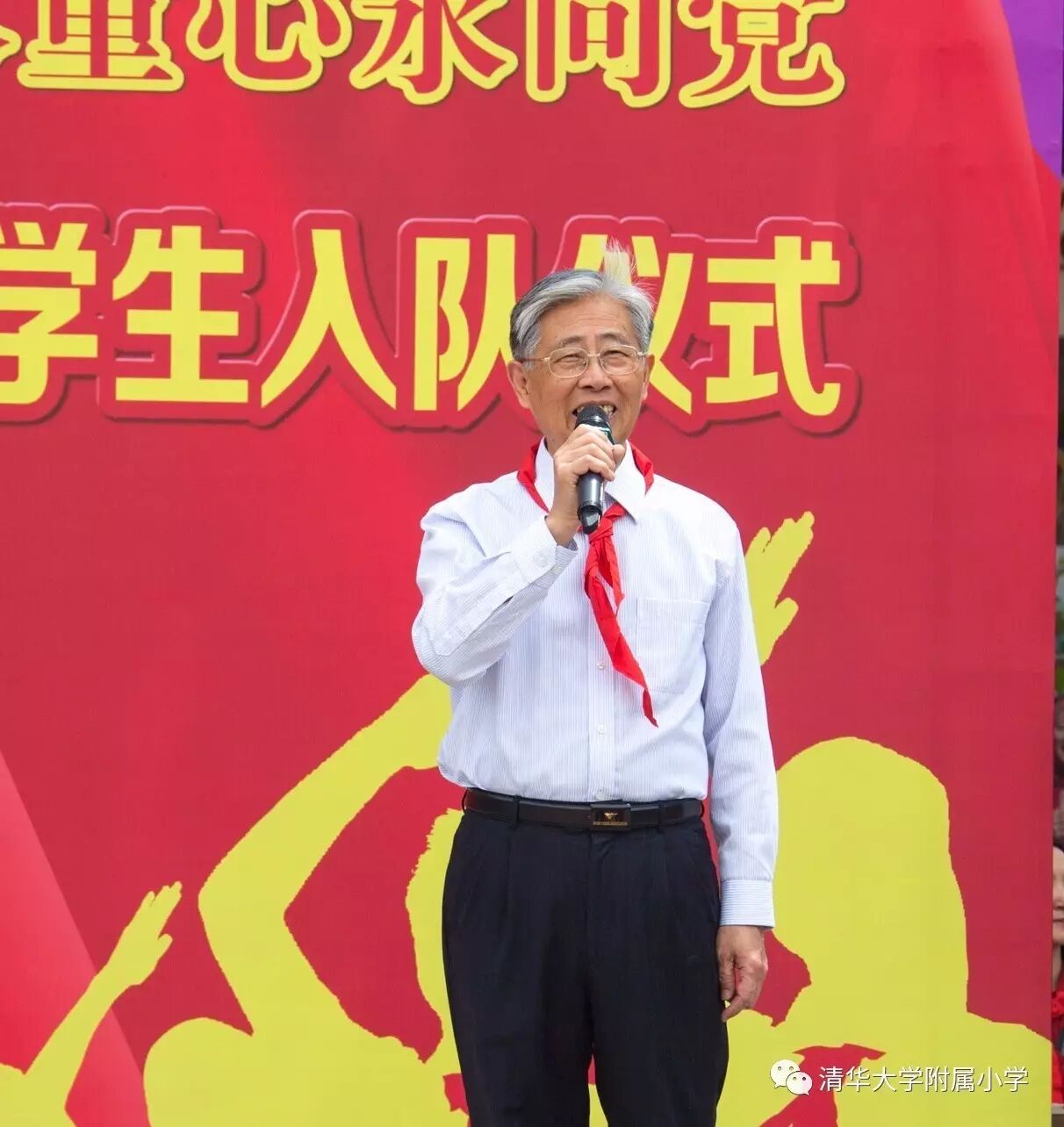 ▲原清华大学党委副书记、清华大学关心下一代工作委员会委员张再兴勉励少先队员