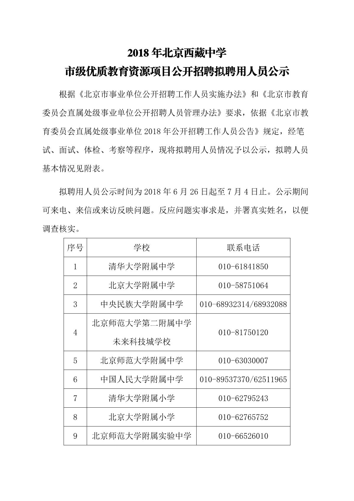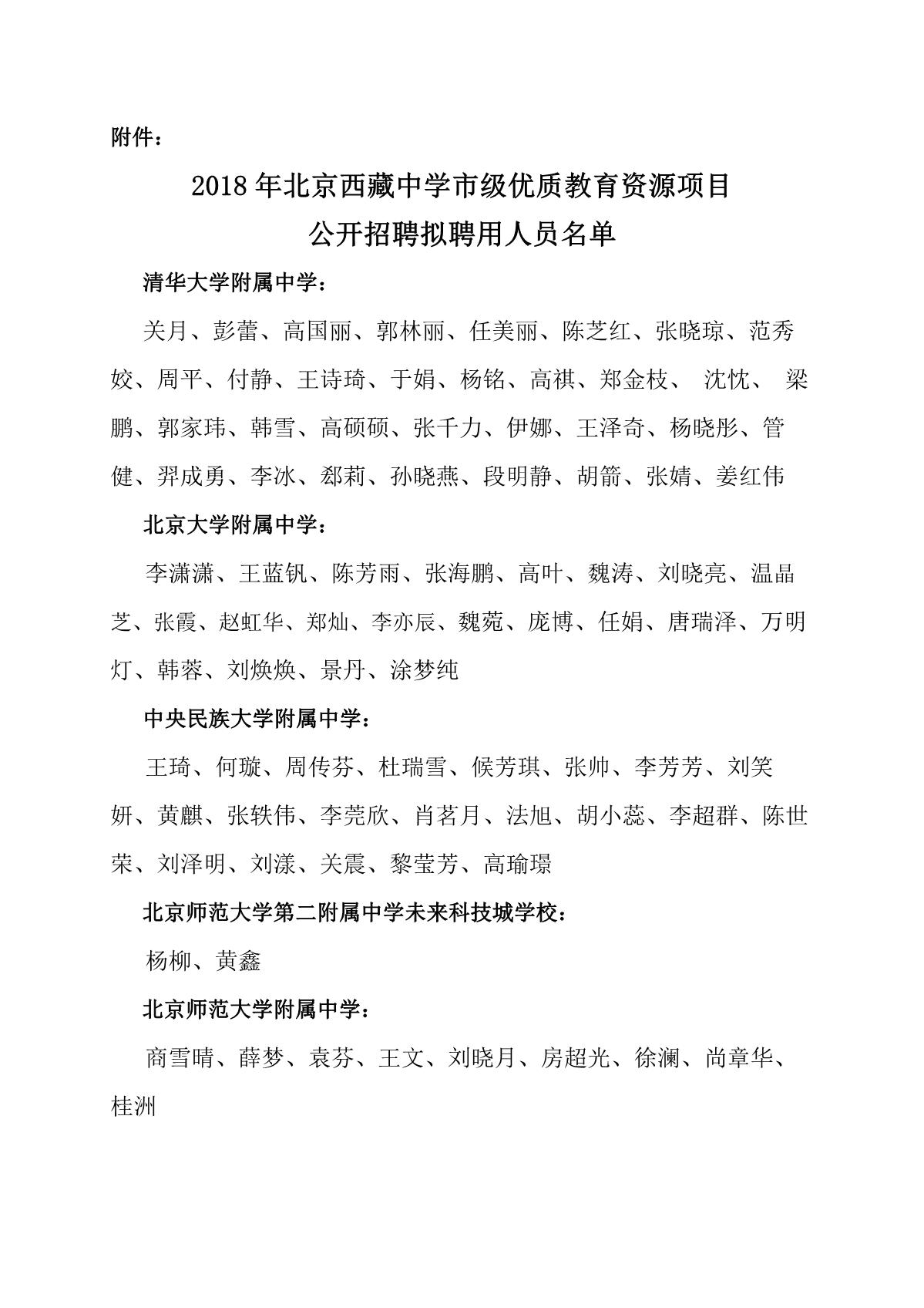 2018年北京西藏中学市级优质教育资源项目公开招聘拟聘用人员公示