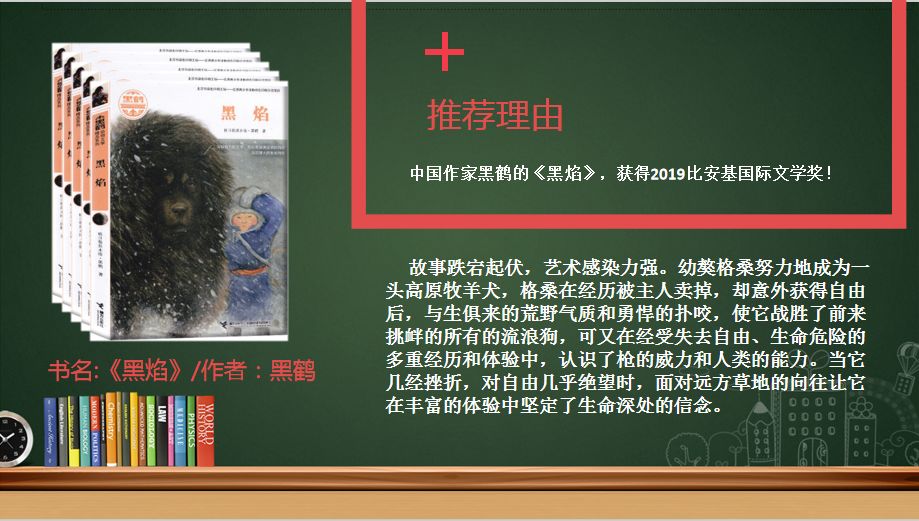 我想起了刚刚获得比安基国际文学奖的中国作家黑鹤写的《黑焰》,并向大家推荐。这本书讲述了幼獒格桑努力地成为一头高原牧羊犬,故事跌宕起伏,艺术感染力强。格桑在经历被主人卖掉,却意外获得自由后,与生俱来的荒野气质和勇悍的扑咬,使它战胜了前来挑衅的所有的流浪狗,可又在经受失去自由、生命危险的多重经历和体验中,认识了枪的威力和人类的能力。当它几经挫折,对自由几乎绝望时,面对远方草地的向往让它在丰富的体验中坚定了生命深处的信念。