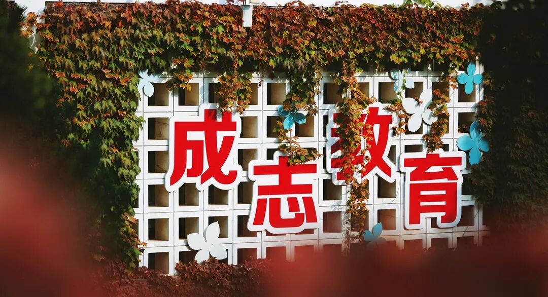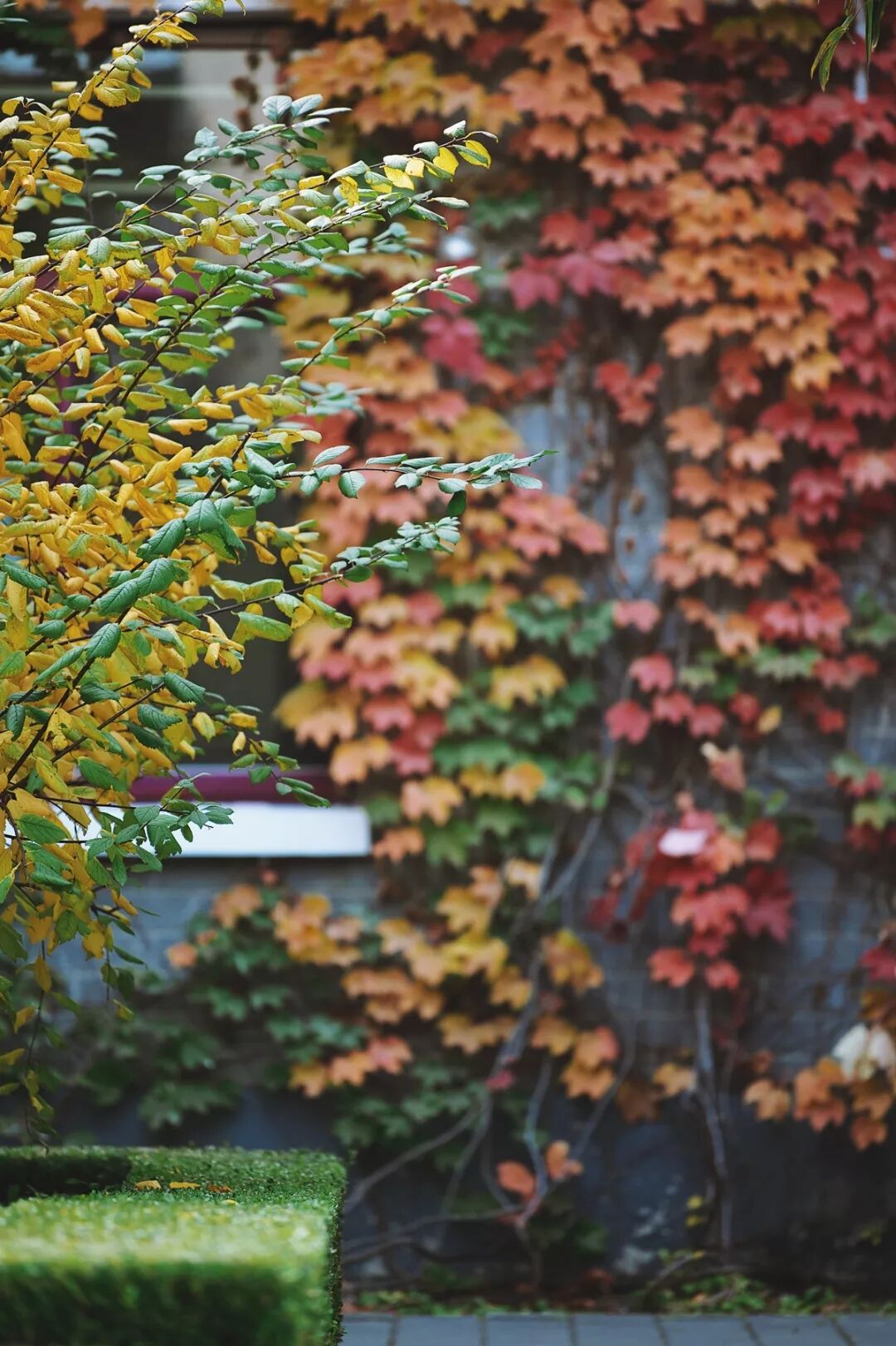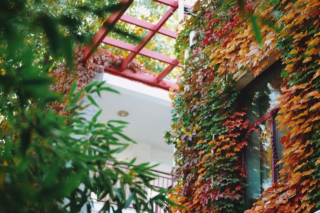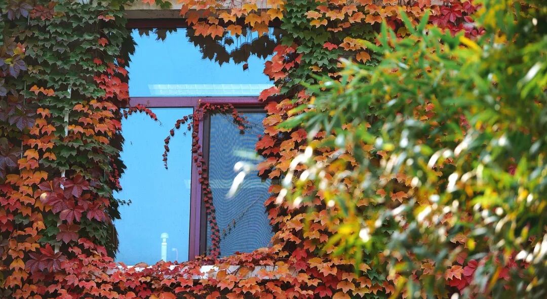 蓝天白云、金色阳光、红叶满墙