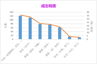 关于个人积极品质,共有536个关键词,出现频率最高的为“坚持”,占58.9%。关于社会关系品质共有166个关键词,出现频率最高的为“团结”,占17.5%。成志特质的关键词共有191个,“公益”(含家国情怀、责任、担当)尤为突出,占35.9%。其次为“读书”占33.1%,再次“梦想”“健康”分别占23.4%和22.2%,还有“感恩”占18.3%。