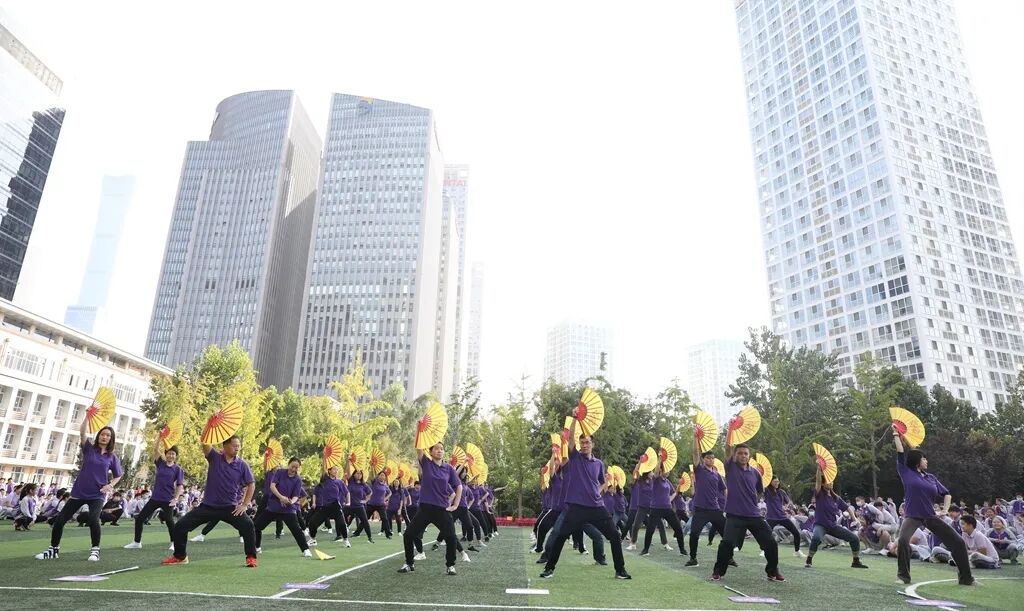 朝阳分校的师生共同展示具有中国文化的太极功夫扇与现代流行的啦啦操,辅以东方古典音乐风格与西方韵律动感的音乐,运动会中洋溢着国际范儿。