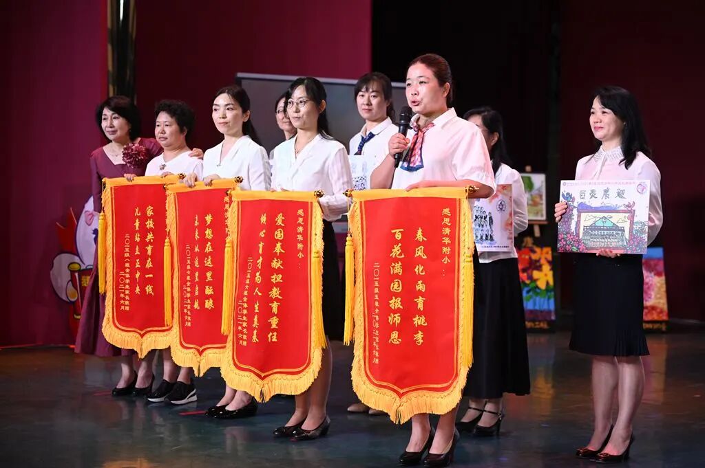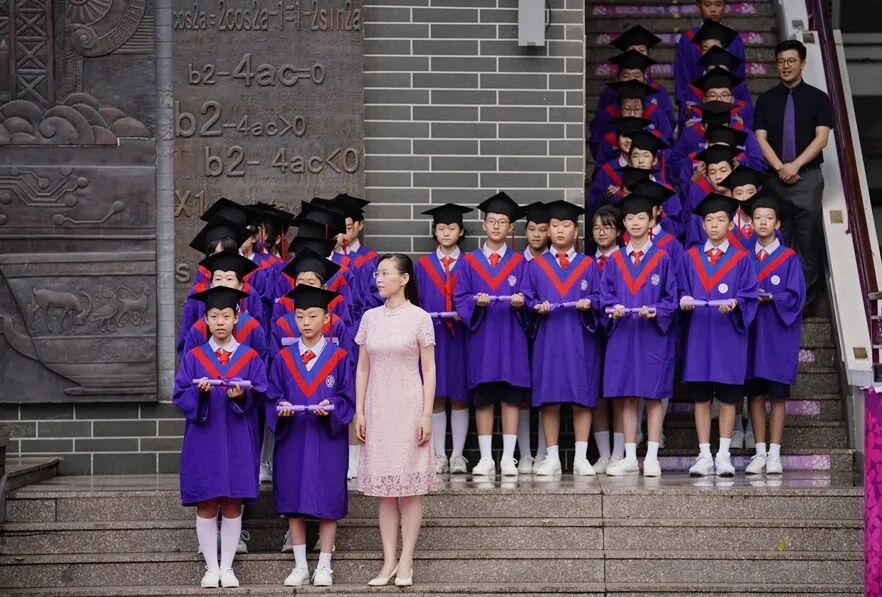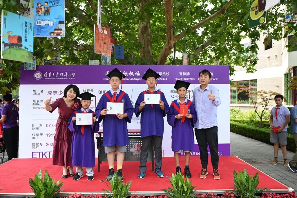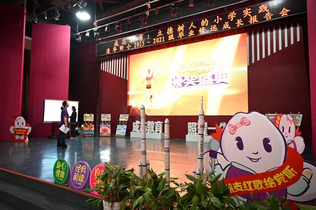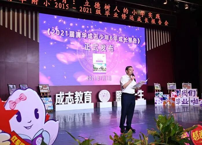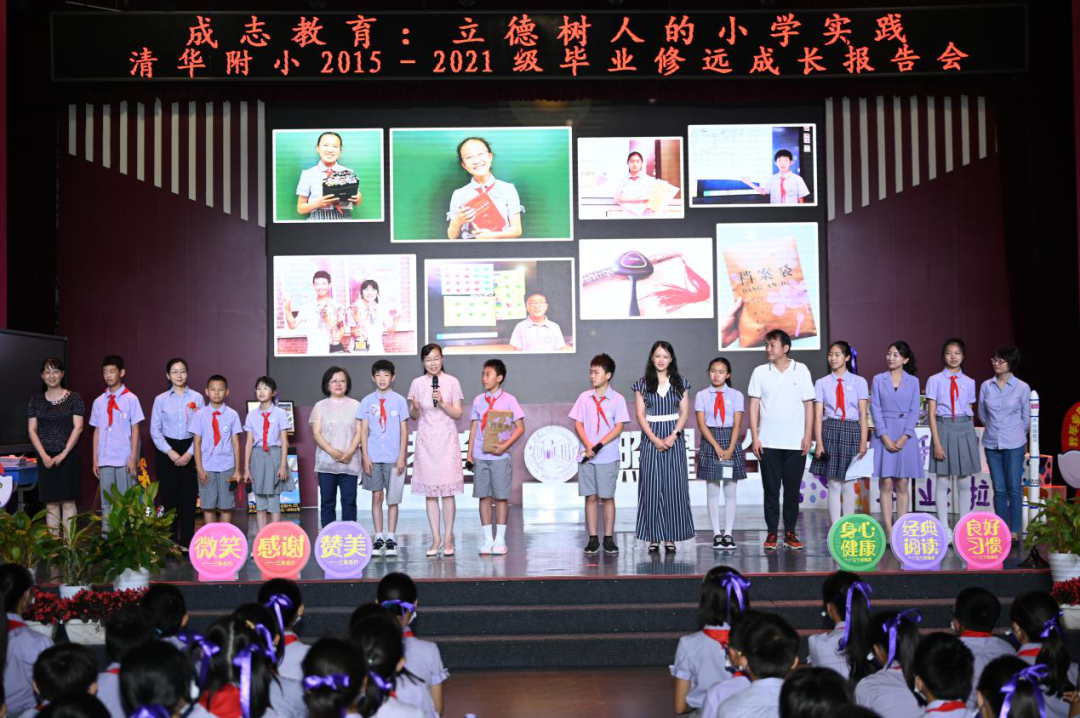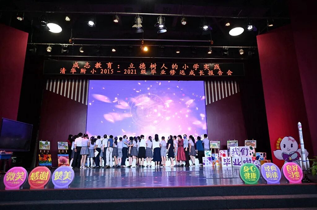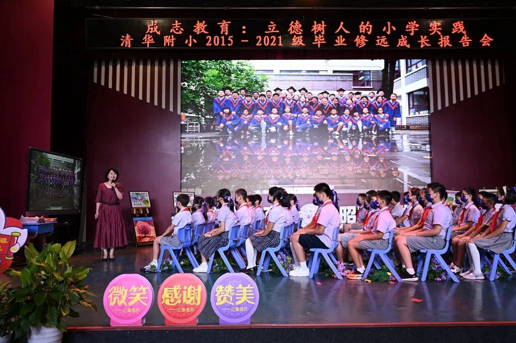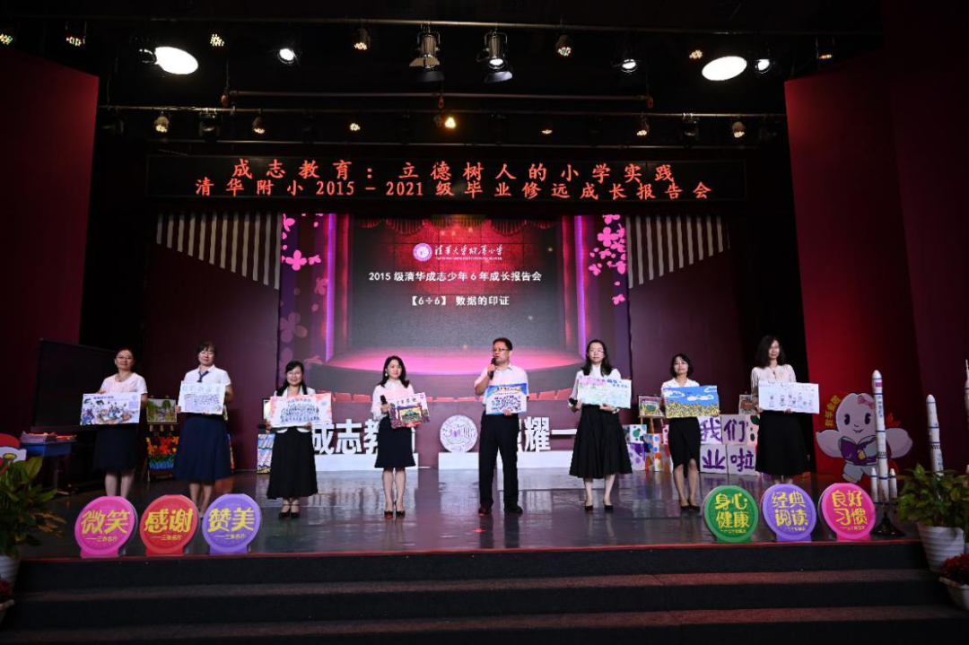 清华附小校长窦桂梅、六年级家委会主席、嘉宾、六年级各班班主任及学生代表共同登台,在屏幕前郑重地按下手印,发布清华附小校级“毕业修远成长报告书”。