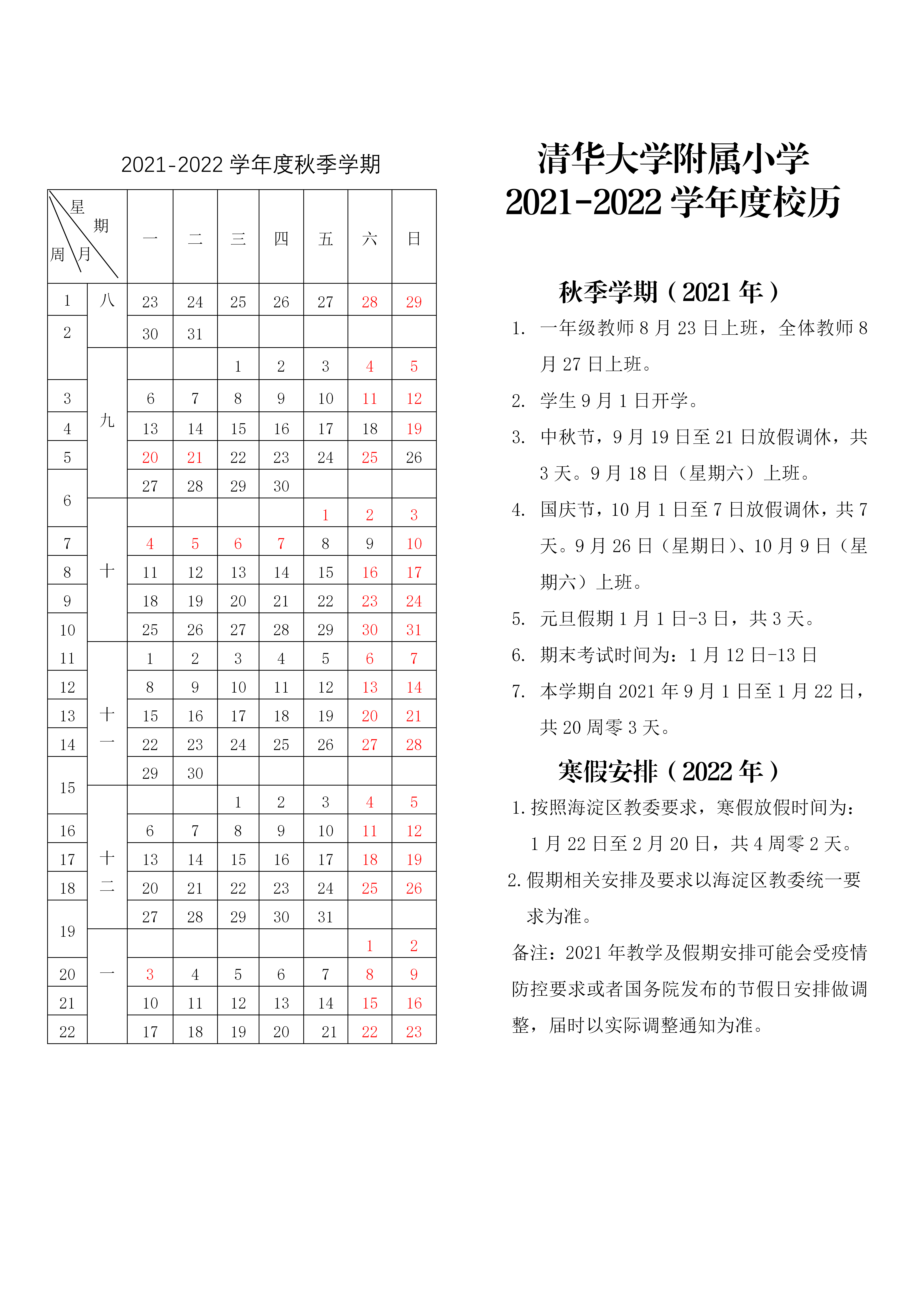 清华大学附属小学2021-2022学年第一学期校历