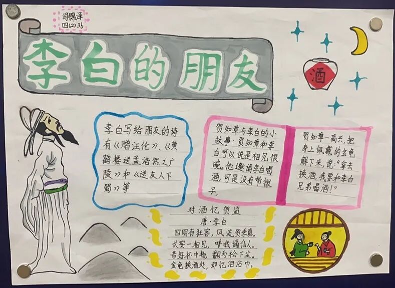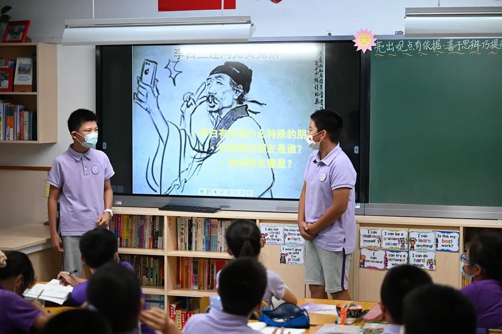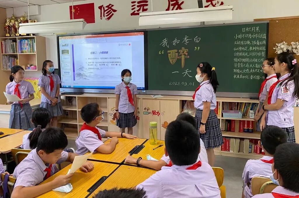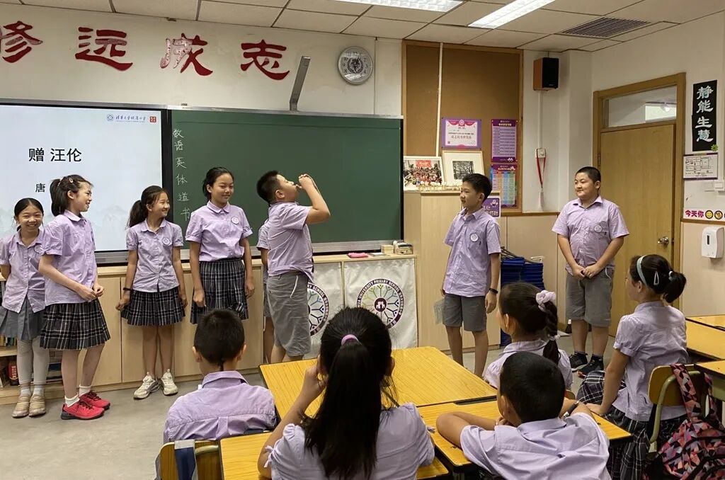 六年级的大哥哥大姐姐走进各班级“讲述李白故事”,讲述有关的诗句、朋友、景点、传统故事。