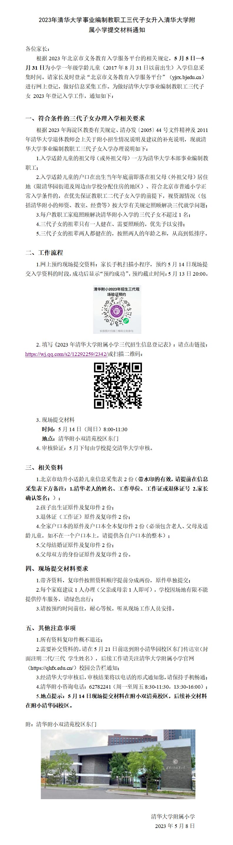 2023年清华大学事业编制教职工三代子女升入清华大学附属小学提交材料通知