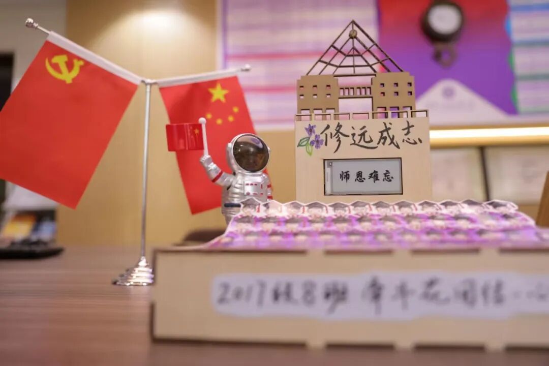 这份礼物格外珍贵,我特别想分享里面的几个数字,他们准备这份礼物,一共用了100多个小时。他们设计、绘图、制作、调试的每个细节,都带着清华附小深深的烙印。这个模型的背景是修远楼,你们从那里毕业;墨水电子屏上滚动的图片、文字涵盖了我们今年的年度主题“致敬中国航天人”;还有每位同学自己绘上去的画像。这个模型总计有近万行代码,用上千度的激光雕刻而成,这一切最终汇成了屏幕中动态呈现的37888个像素点……这真是了不起的创造!这充分体现了六8班同学的集体智慧,更展现了我们毕业班所有同学们以健康、阳光、乐学的姿态,走向未来的自信与豪情。