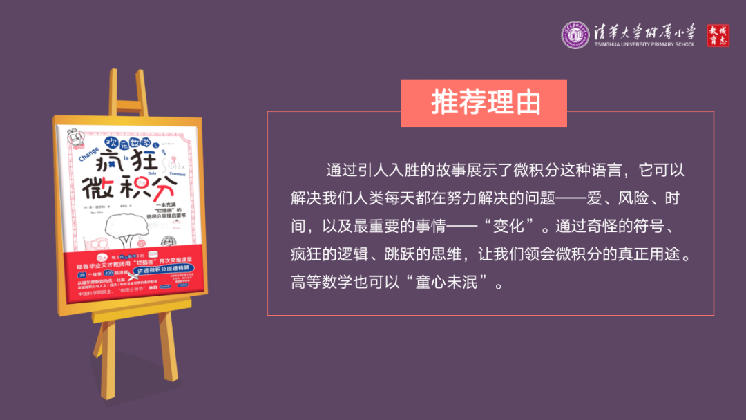 在长满书的大树下,历年的毕业典礼上,窦老师都会推荐三本书。当我看到这本《疯狂的微积分》时,我发现如此有趣的数学,用奇怪的符号、疯狂的逻辑、跳跃的思维,让我们走向深刻,走向理性,用最感性的方式来描绘这份童心未泯吧。