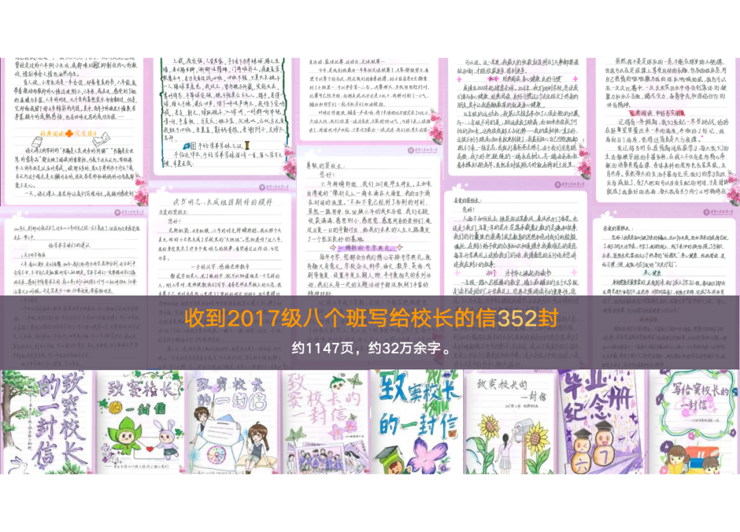 除了这份礼物,我还收到了每一位毕业生写给母校的一封信。总计352封,1147页,32万余字。字里行间里我读到了同学们暗藏的“身心健康”“经典阅读”“良好习惯”三件终身法宝,其中提到“经典阅读”有339人次,“身心健康”340人次,“良好习惯”130人次。