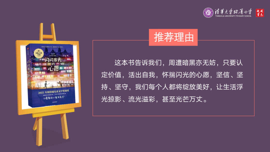 希望你们前程远大!所以窦老师再一次推荐给你们这本2023年收录在国图的获国际大奖的书《闪闪发光的心愿》。我想只要你活出自我,怀揣这份心愿,坚定坚持坚守,你去创造一份周遭的一切的美好,你的心将永远闪闪发光。