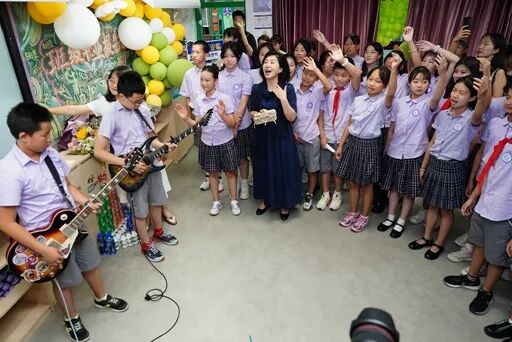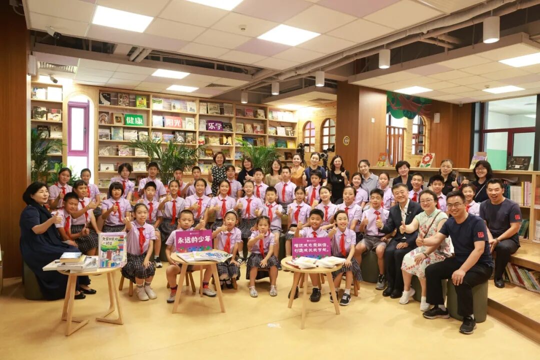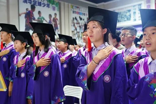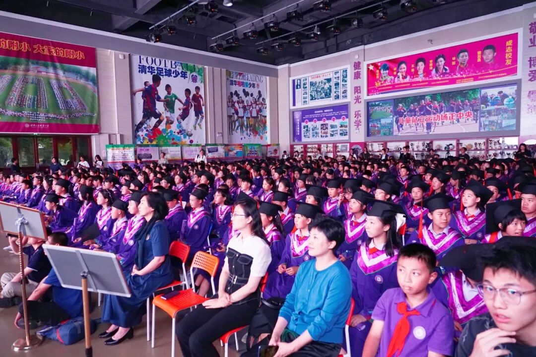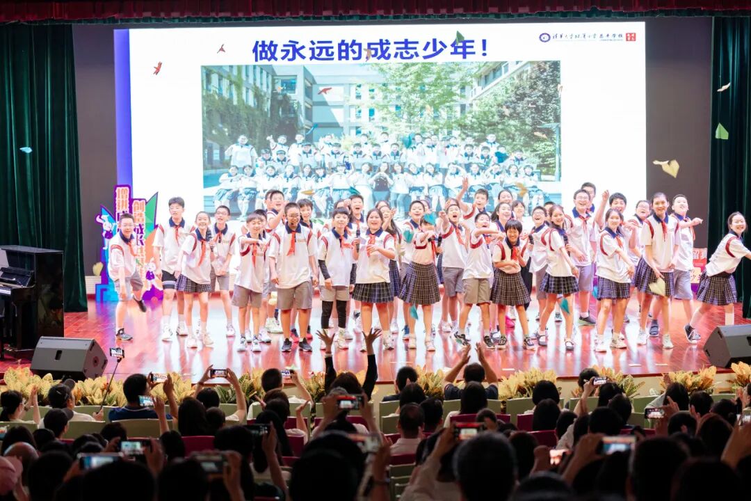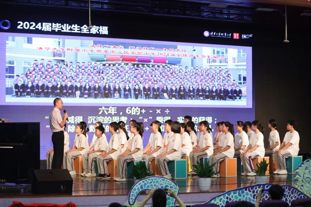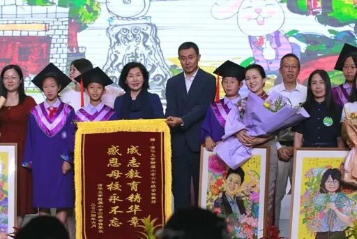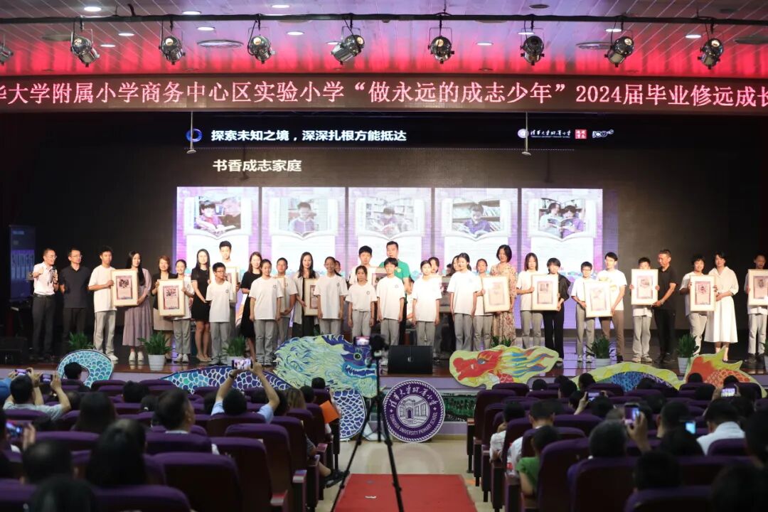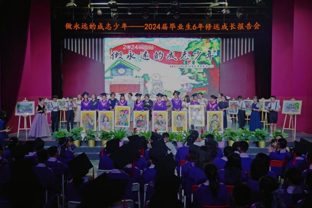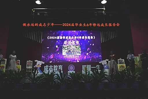 六年级家委会主席、嘉宾,各班班主任、家长和学生代表共同登台,在屏幕前郑重地按下手印,发布“2024届清华成志少年6年成长报告”。