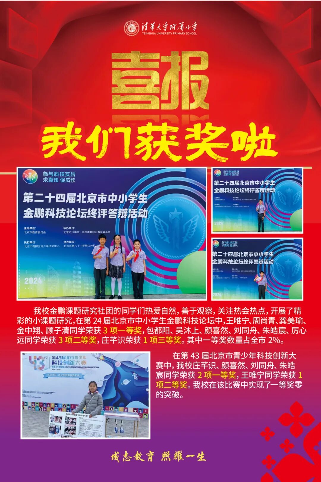 清华附小昌平分校的同学们在第24届北京市金鹏科技论坛中获得1项一等奖,1项二等奖;在2024年上海头脑奥林匹克创新大赛中获得全国二等奖。