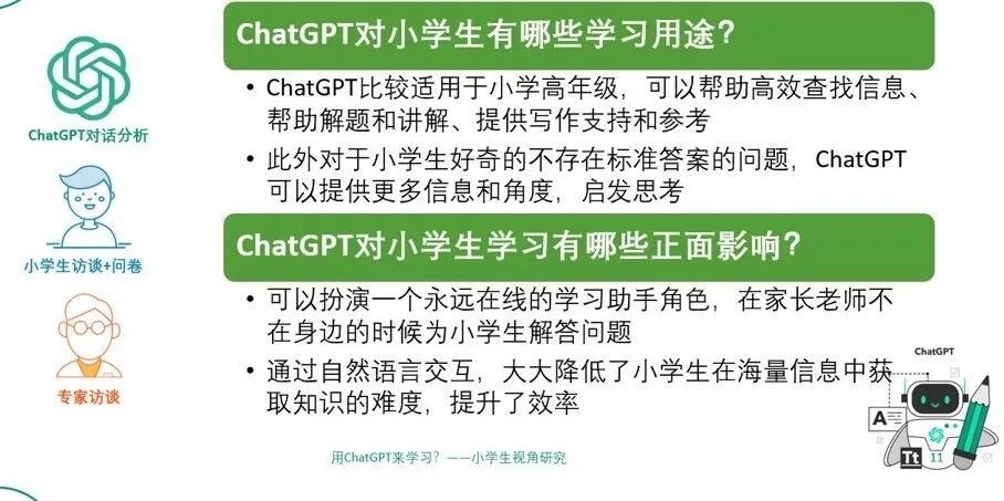 五年级的科学小组成员通过亲身体验、现场访谈、调查问卷等方法开展了用ChatGPT来帮助小学生学习的人工智能小课题研究。