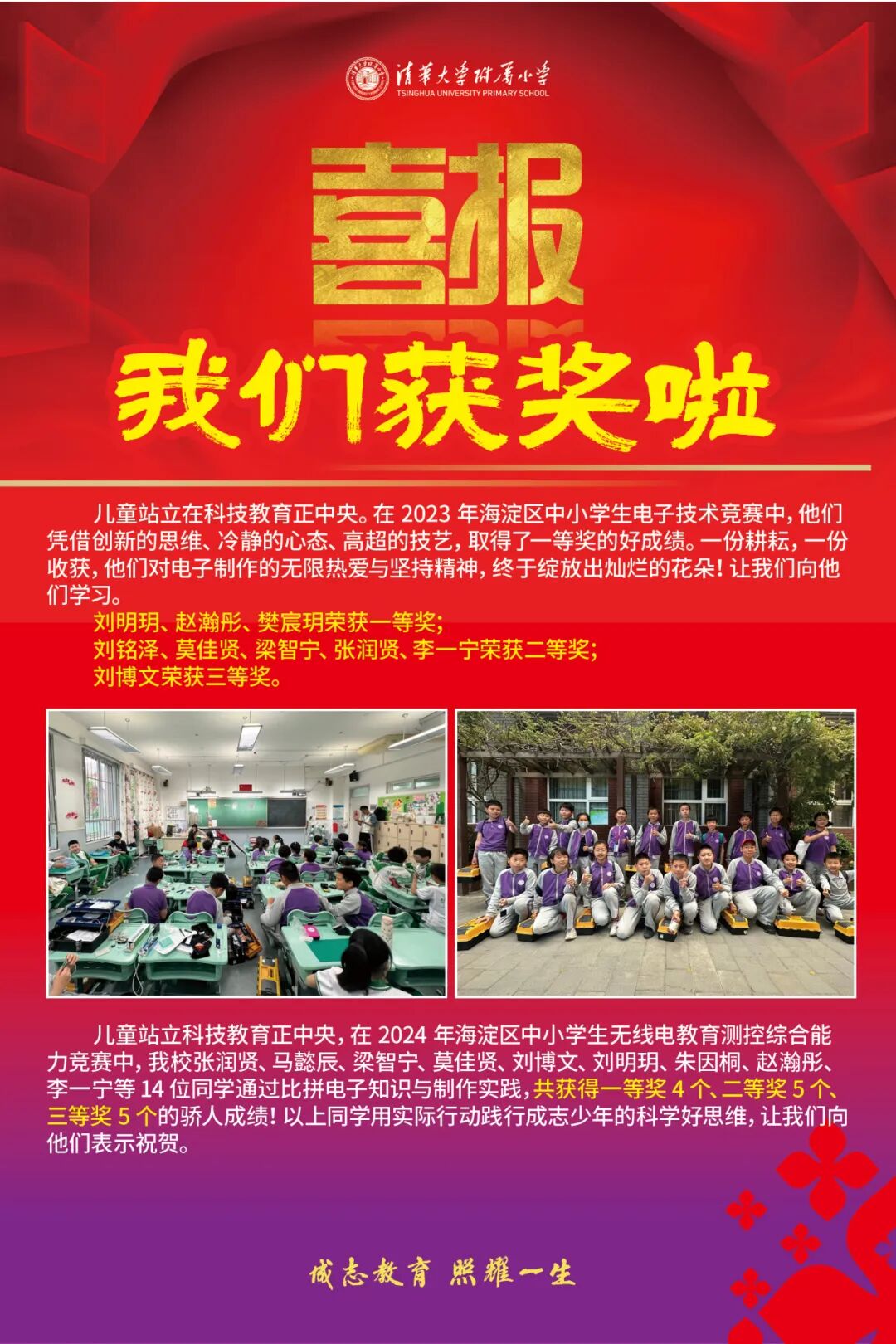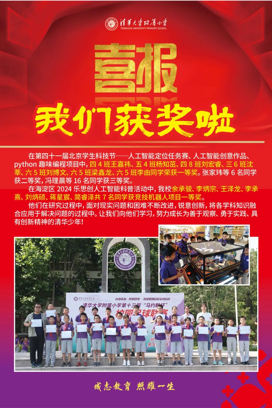 在2024年上海头脑奥林匹克创新大赛暨第45届世界头脑奥林匹克选拨活动中荣获华北区一等奖,清华附小代表团荣获北京赛区“杰出团队奖”。人工智能社团、信息学社团在北京市学生科技节、海淀区中小学信息学竞赛中包揽一、二、三等奖。金鹏课题研究社团在第24届北京市中小学生金鹏科技论坛中荣获3项一等奖,在第43届北京市青少年科技创新大赛中荣获2项一等奖的好成绩!电子创客社团在海淀区无线电教育测控竞赛中独揽4项一等奖,无人机社团荣获4项全国一等奖。
