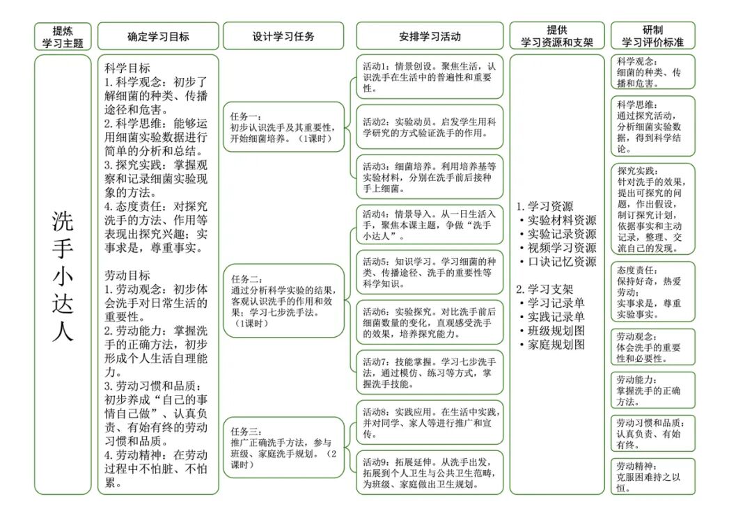 我们在亲身体验中爱上洗手:劳动跨学科课程《一日生活洗手小达人》。我们学会了正确的七步洗手法,通过实验探究、数据分析,知道了正确洗手可以有效地减少手部细菌,养成了会洗手、爱洗手的好习惯,争做一日劳动生活的洗手小达人。