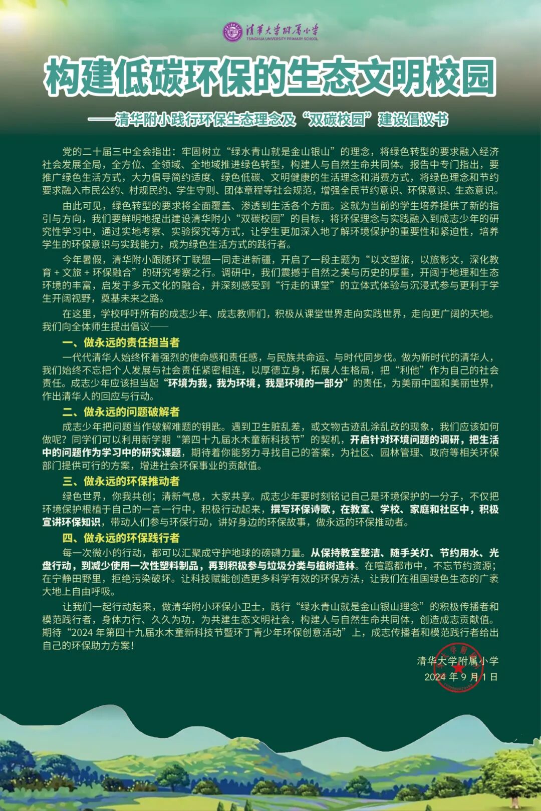 人类是一个休戚与共的命运共同体,低碳环保应该成为我们每个人的生活方式,且听AI小志发布《清华附小成志绿色倡议》:“这份绿色倡议,既是我们为祝福祖国母亲75周年华诞奉上的心意,也是我们迎接母校110周年校庆的献礼。”