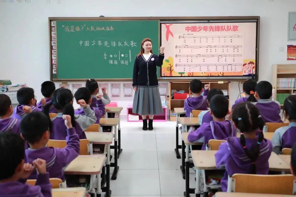 戴上红领巾的那一刻,心儿砰砰跳!老师教我们唱《中国少年先锋队队歌》,我们在歌词中了解了红领巾的历史,我们在学习时表达了对入队的期盼,我们在入队仪式上用艺术表达成志的目标与信仰!