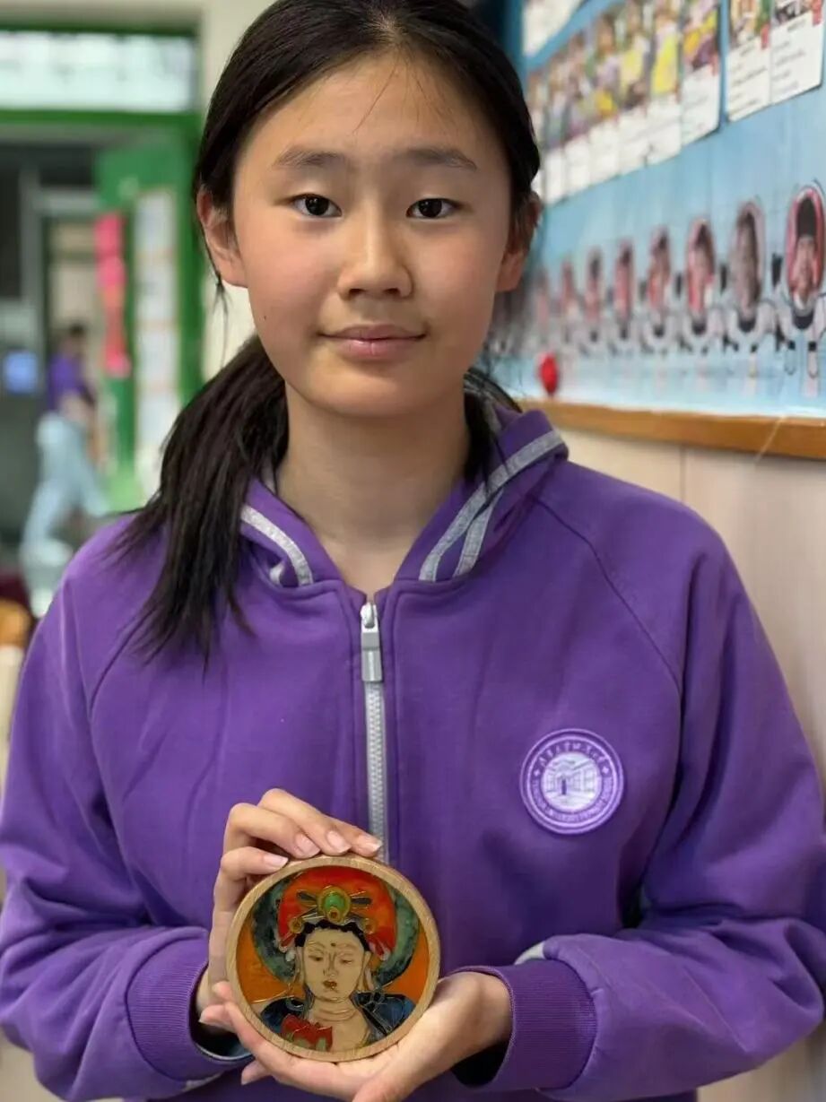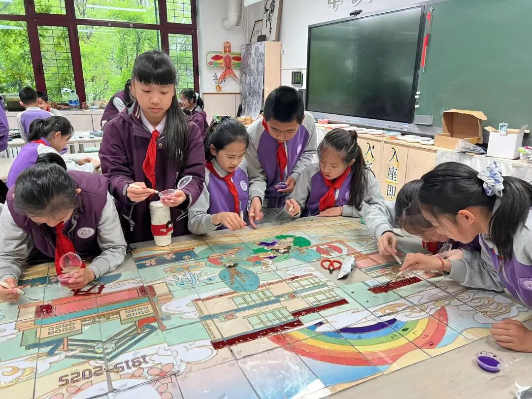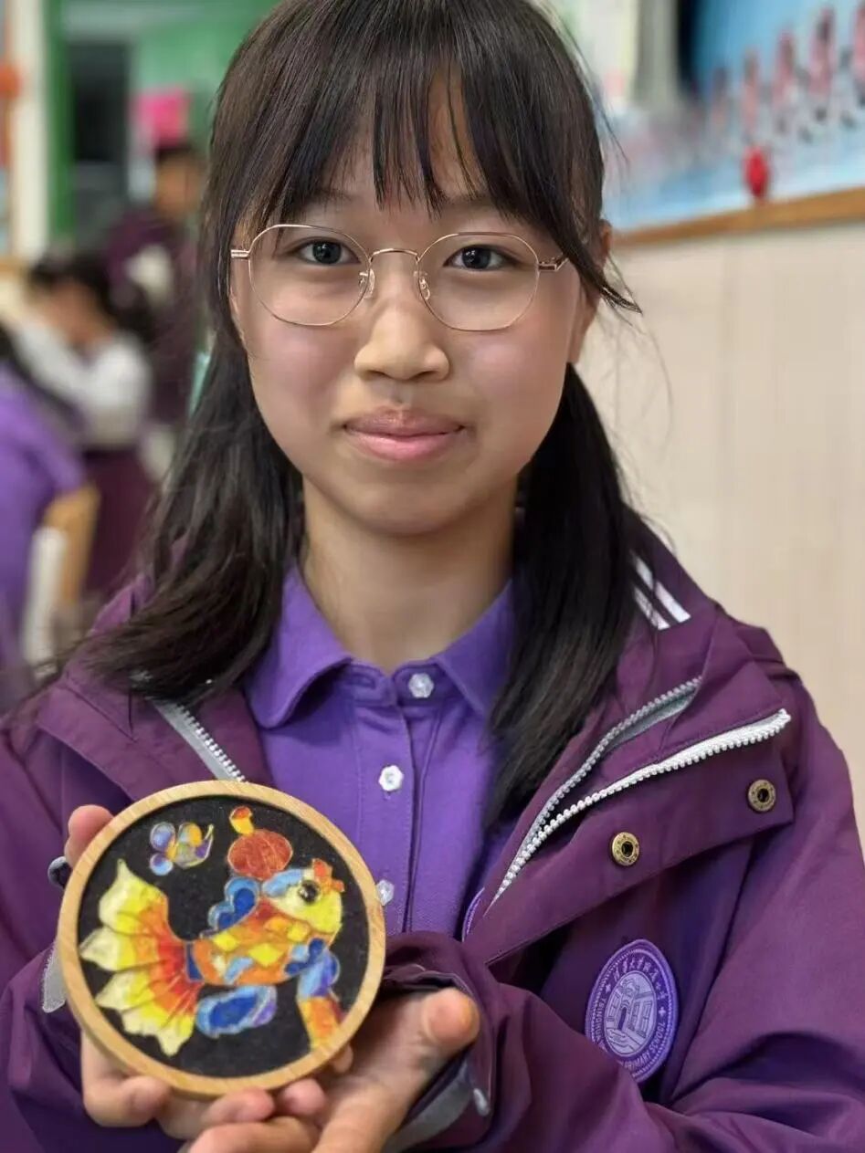 人人会非遗,班班有展示。六年级毕业班级全员参与到掐丝珐琅的非遗创制中,利用掐丝设计精美的非遗纹样,铺染矿物质色彩,体验珐琅的绚丽多姿,每人都有自己的小作品,最后还能汇到一起,亲近中华优秀传统文化非遗艺术,用艺术作品祝福母校,表达我们对母校的依依惜别之情。