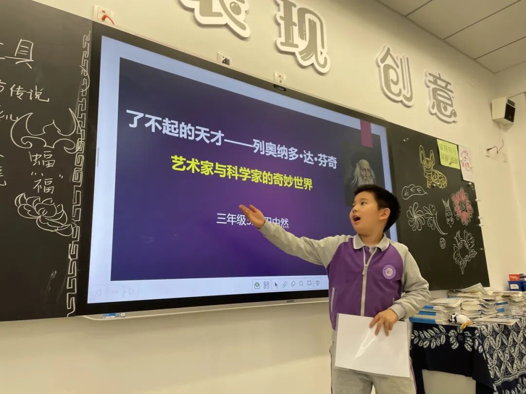 课前三分钟,人人开口讲。我们一直在艺术课上坚持课前三分钟的演讲,在美术课上宣扬艺术家的故事,给同学们介绍自己感兴趣的生活艺术品。