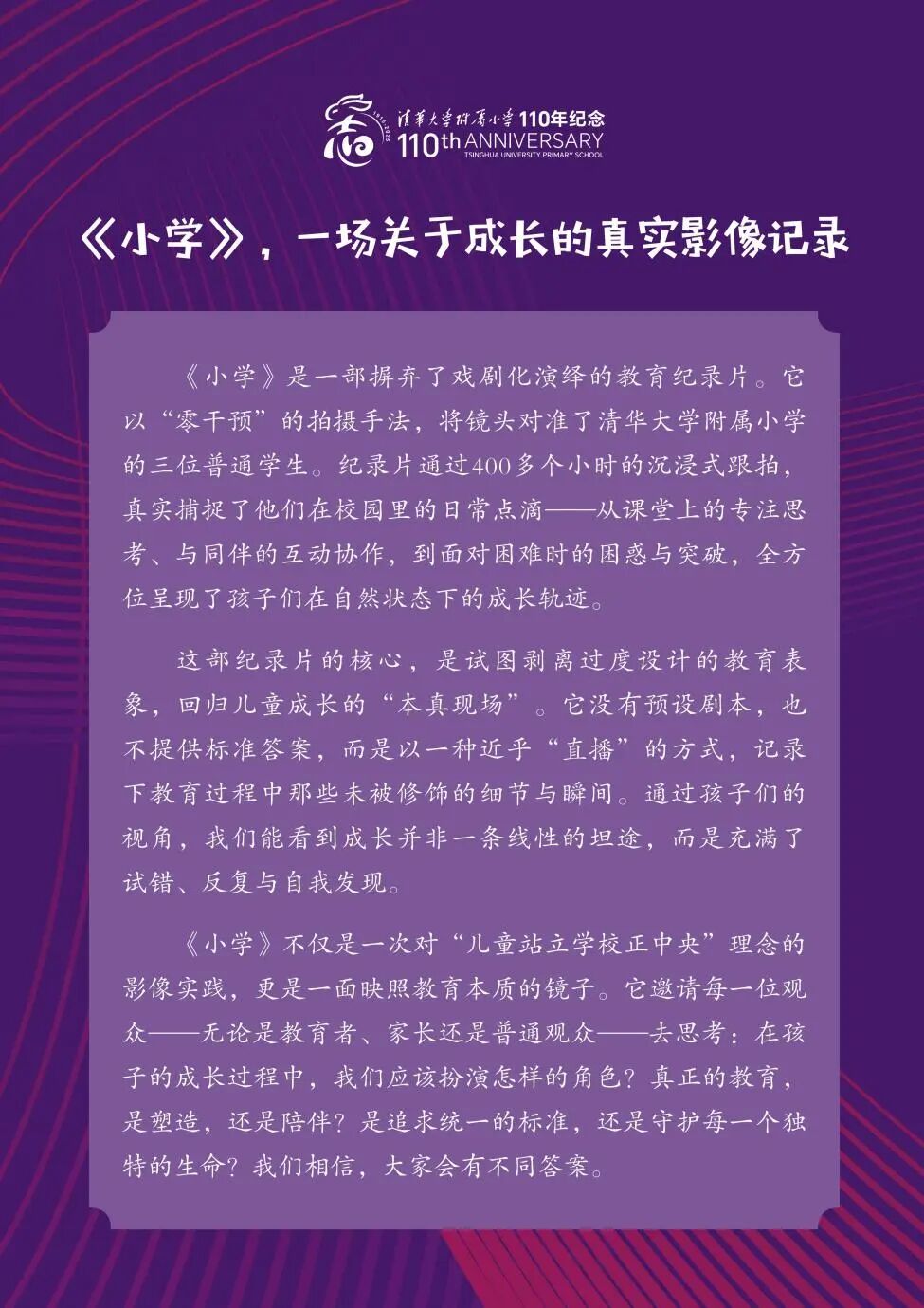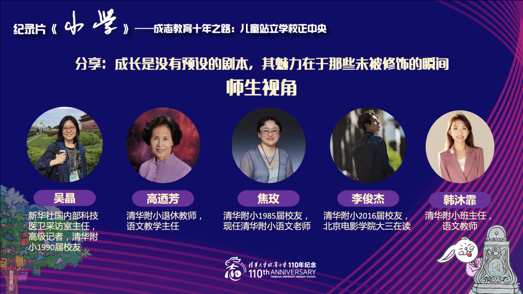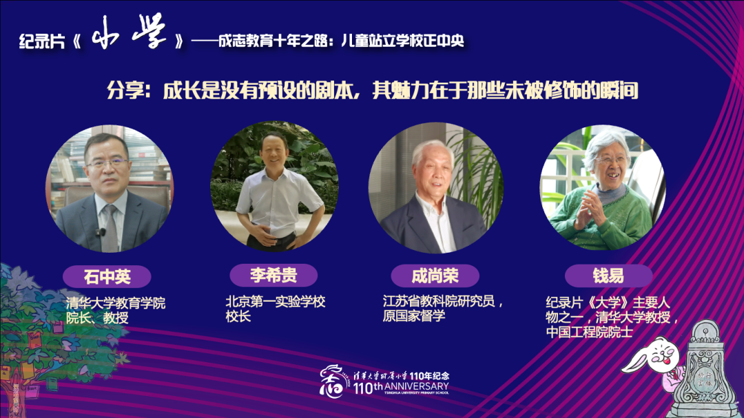 我们原来看过《大学》,今天来看《小学》,用纪录片来做110周年的主题,这个设计特别有内涵,这是对这个十年的总结,又是继往开来,难度是非常非常之大的。