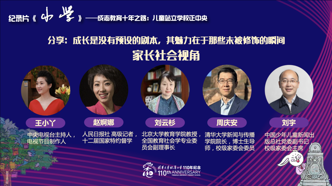 我今天来到小学只有一个身份,那就是一名曾经的清华附小学生的家长。在这部影片当中我们看到的更多的是学生、是老师、是校园,但实际上还有非常重要的两个维度,一个是家庭,一个是社会。