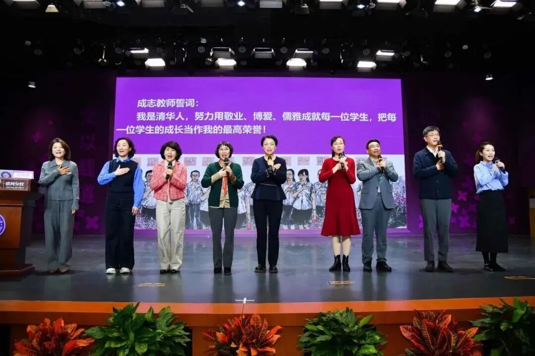 六位不同发展阶段的语文教师代表王峰、邱晨晨、赵丽娜、林长山、胡兰、王玲湘依次走上舞台,用自己的成长故事勾勒出清华附小教师集体人格的生成脉络。从初登讲台的青涩到引领团队的成熟,他们用日复一日的坚守,年复一年的耕耘共同印证一个朴素的道理:教育家精神并非遥不可及,它正是在“坚守三尺讲台、专注一间教室、扎根一所学校”的持续践行中,悄然完成对教师集体人格的塑造,并焕发出蓬勃而持久的生命力,同时彰显了教育家精神引领下教师集体人格的凝聚与传承。