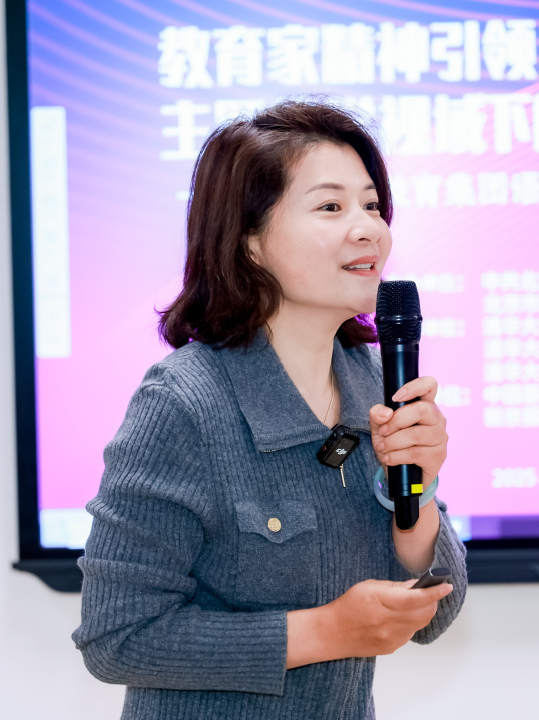 窦桂梅校长与语文教学团队代表围绕“主题教学视域下的教师集体人格塑造”这一主题,分享了清华附小教育集团在理论创新、课堂实践以及团队共生中的思考与实践。窦校长表示,坚守三尺讲台、专注一间教室、扎根一所学校是践行教育家精神的三个维度,希望老师们能够以破解教育困境为己任,在激励相容中凝聚集体智慧与力量。