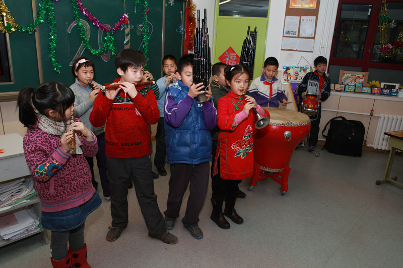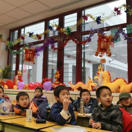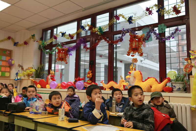 每间经过学生、家长、老师精心装点的教室,都弥漫着浓厚的新年气氛。由气球、彩灯、剪纸、生肖装点的低年级教室,五彩缤纷、龙腾虎跃。用文化旗书写龙的历史、自制“足球“龙年台历的中年级教室,被浓厚的“龙”的文化包围着。而把写有感恩父母、老师、同学、学校字样的新年卡片组成的心形图案的高年级教室,则披上了浓浓的感恩色彩。