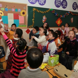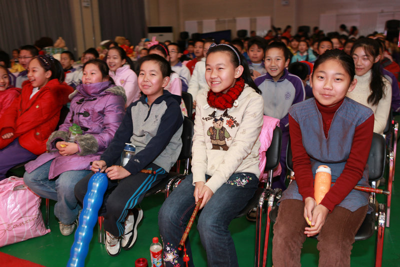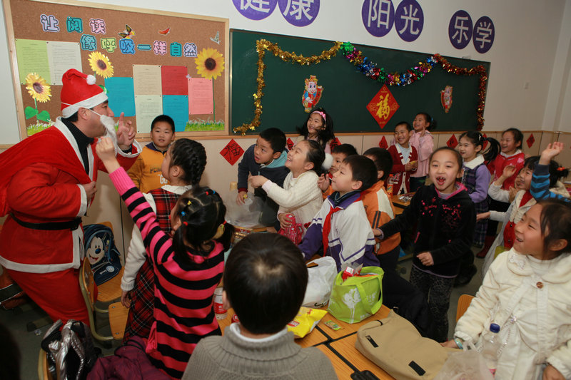 把联欢会推向高潮的是校领导们逐个教室的亲切慰问,窦校长像顽童般的轻轻敲门,然后在同学们的欢呼和簇拥中欣赏节目,与学生共享新年的喜悦。工会主席郭鸣剑老师扮演的“圣诞老人”,给大家带来了意外的惊喜和热情,大家都渴望能得到一份幸运的新年礼物。