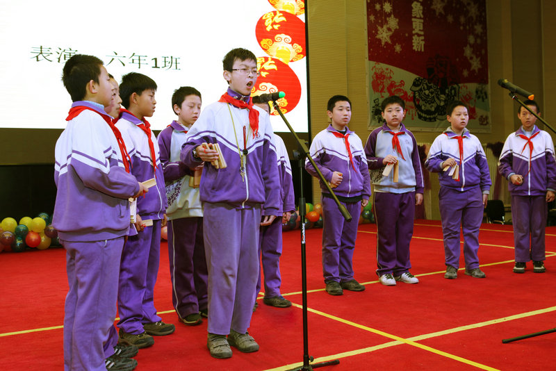 随着《春节序曲》的响起,窦桂梅校长首先向全校师生致新年贺词,她说2011年,是喜获丰收的一年,在这一年里,我们进行了抗震加固、校园文化建设,学校发生了翻天覆地的变化;我们进行了课堂改造,凝聚着老师智慧结晶的《乐学手册》为学生们减轻了课业负担;教学上硕果累累,连续五年海淀区117所小学五年级综合素质测评中,语、数、英成绩名列前位。荣获“北京市课程教材改革一等奖”,还被评为“国家基础教育课程教材改革试验项目学校”;我们还获得了金帆乐团称号,体操、合唱分获全国、北京市一等奖……所有的成绩作为礼物,将珍藏在附小师生2011年的记忆里,面对2012年,我们将再创辉煌。