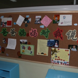 亮点二:在教室外面的文化墙上,贴满了《爸爸妈妈对我说》的小卡片和信笺。一句句感人至深的话语,一段段发自肺腑的祝福,让人感动不已。从宇航的爸爸妈妈的卡片中,能感受到孩子的进步,父母也希望他越来越健康阳光!EUA的父母例举了孩子四个月的学校生活,在身体健康、交友、识字、发言、照顾弟弟等五个方面的可喜变化,他们为有这样健康、美丽、可爱、好学的女儿而骄傲,为选择了这所学校而庆幸,为遇到这样的老师而自豪。字里行间充满了感恩。家长陈君最满意学校让孩子学会了阅读,有了清华孩子的书香气质。家长刘践感受到了学校对体育锻炼的重视,一周四节的体育课和跳绳运动、多套广播操让孩子获得了健康的体魄……