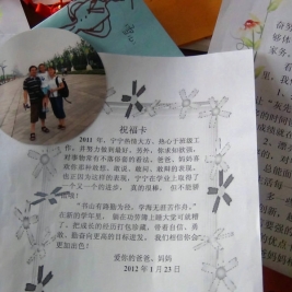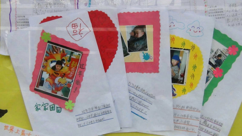 制作贺卡的人员几乎是全家总动员,有爸爸妈妈、爷爷奶奶,还有兄弟姐妹。爷爷颤巍巍地留下了这样的祝福:“祝愿你在新的一年里,认清形式,不论身体学习等方面遇到什么坎坷,都能坚定信心,不屈不挠。为了周总理所说的“为中华之崛起”奋力学习,在祖国的百花园中成为一朵艳丽、漂亮的花朵。”也有俏皮的祝福:“希望你向喜羊羊的机智勇敢、向沸羊羊的健康、向灰太狼的执着和永不气馁学习!”