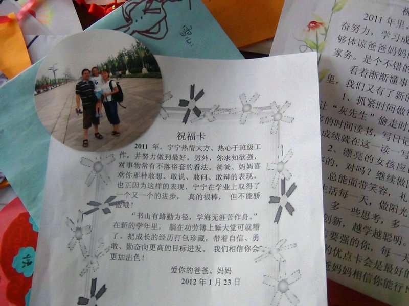 在众多的贺卡中,家长们普遍重视孩子的良好品质的养成和综合素质的提升。比如从“妈妈很享受每天早晨你做的煎鸡蛋,亦很欣赏你拖地洗碗时的神态!” 和“这个寒假你一直在家照顾姥姥,现在姥姥恢复好了,这里面有你很大的功劳!我们都谢谢你,祝你这一年都快乐!”的话语中,体现了父母对孩子参加家务劳动、关爱他人品质的重视;从“你要积极参加班级活动,要记住:吃亏是福!”、“不求人人为我,但求我为人人!” 以及“你不必是了不起的人,但你得看得见了不起的人;你不必挣很多钱,但你一定要学会慷慨!你不必报答我,但你一定要学会感恩;不管你长大了做什么,但是一定要学会担当、负责任!”的话语中,我们看到了家长对孩子常怀感恩、勇于担当、关心集体等品质的培养;而从下面这两段话中:“孩子,最让妈妈感到自豪幸福的不是你考了多少个第一、获得多少奖项、更不是被点招,而是我的孩子,你依然拥有一双明亮的眼睛!让我们继续约定,实现‘耳聪目明身体健,阳光快乐光明行!’”以及 “进入五年级,你要面对各种考核和评估测评的压力,尽人力、随天意。你要重视体育锻炼,在运动中培养自己坚强忍耐,勇于承受压力,以求塑造出真正的男人个性!快乐之余,多学习、多思考、多锻炼!” 你看到的是不唯分数、重视孩子身心健康发展的清华家长的形象。